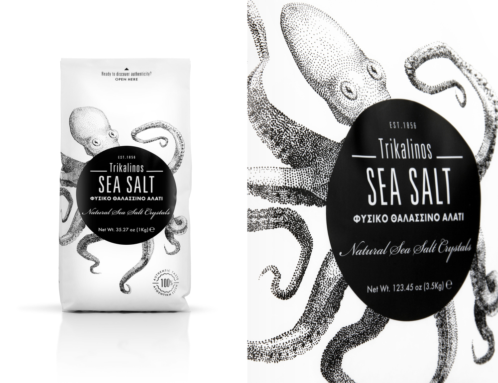 包裝設(shè)計(jì)公司采用了章魚卡通形象作為主形象,既俏皮,又體現(xiàn)了海鹽的產(chǎn)品特色。章魚整體的形象,用海鹽的晶體體組成,強(qiáng)化海鹽識(shí)別。包裝整體風(fēng)格用了黑色兩色,又讓整體包裝提升了檔次感。