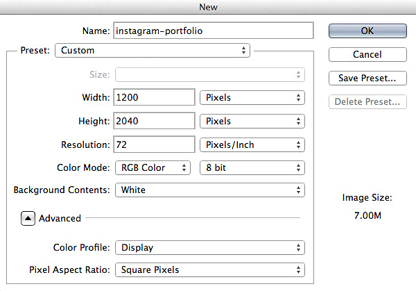 首先使用下面所示的設(shè)置創(chuàng)建一個(gè)新的Photoshop文檔(File> New ...)。您可以隨意使用任何您喜歡的尺寸的畫布 - 畢竟網(wǎng)頁不是固定的寬度。