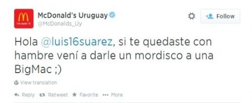 而在蘇亞雷斯的祖國烏拉圭,麥當(dāng)勞烏拉圭公司也跳出來湊熱鬧,他們在推特上@蘇亞雷斯,并用西班牙語寫道,“你好,蘇亞雷斯,如果你真的餓了,為什么不嘗嘗麥當(dāng)勞巨無霸堡呢?”