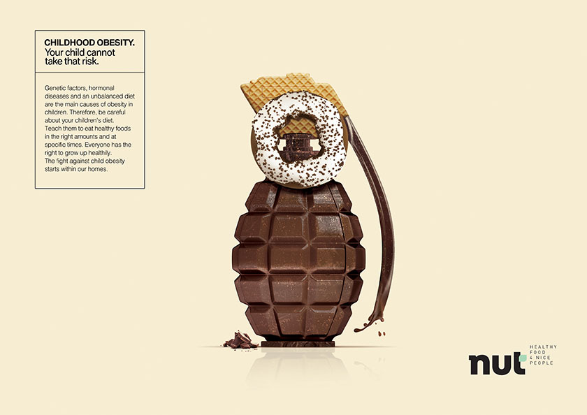 知名堅果品牌nut,從當(dāng)前愈發(fā)讓家長擔(dān)憂的兒童肥胖癥出發(fā),推出一組平面廣告設(shè)計。用于說服家長們積極改善孩子們的飲食結(jié)構(gòu),把nut產(chǎn)品加入食品采購清單。
