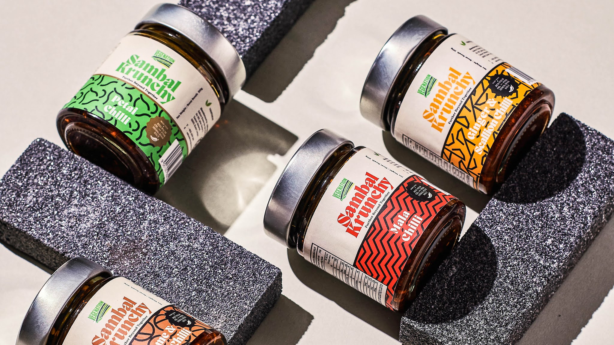 Vegenation 是一家馬來西亞有機(jī)素食公司,致力于為世界帶來美味健康的素食產(chǎn)品。受馬來西亞傳統(tǒng)蠟染圖案的啟發(fā),包裝設(shè)計(jì)公司對其進(jìn)行了現(xiàn)代化和最小化,并將其轉(zhuǎn)化為大膽的圖案,以反映每種口味的味道和質(zhì)地. 鮮艷的色彩背景是根據(jù)蔬菜產(chǎn)品的顏色挑選的,充滿活力和色彩。包裝設(shè)計(jì)公司基于這個(gè)想法為他們的第一個(gè)產(chǎn)品 Sambal Krunchy 創(chuàng)建了一系列包裝設(shè)計(jì)。