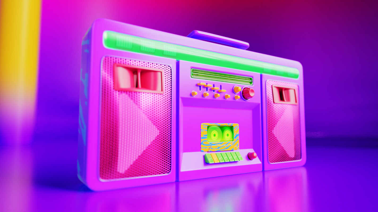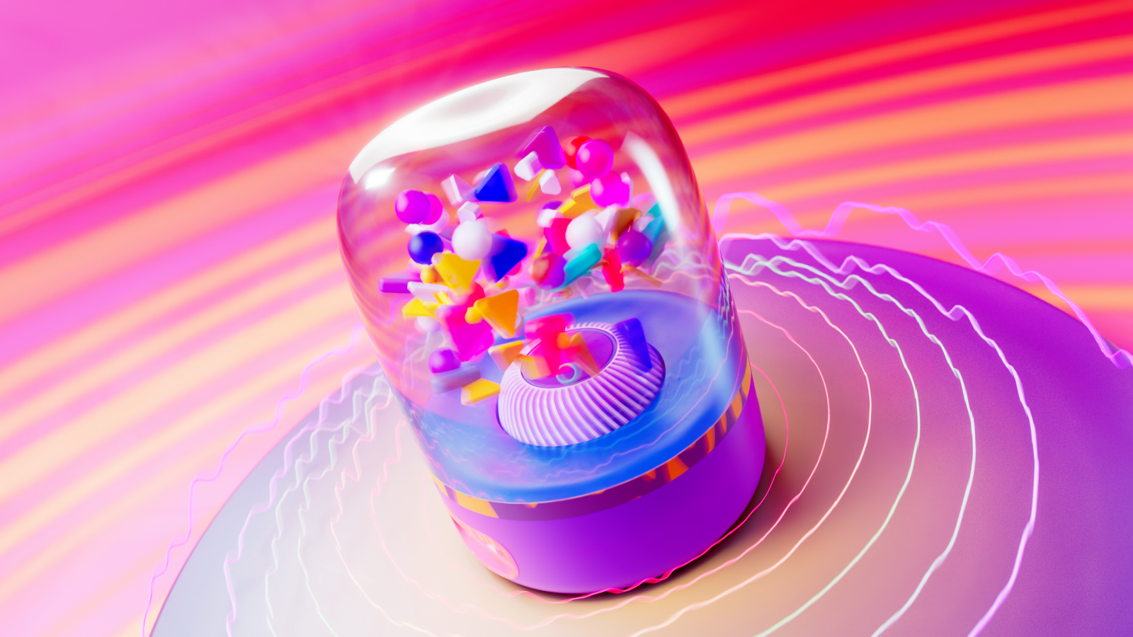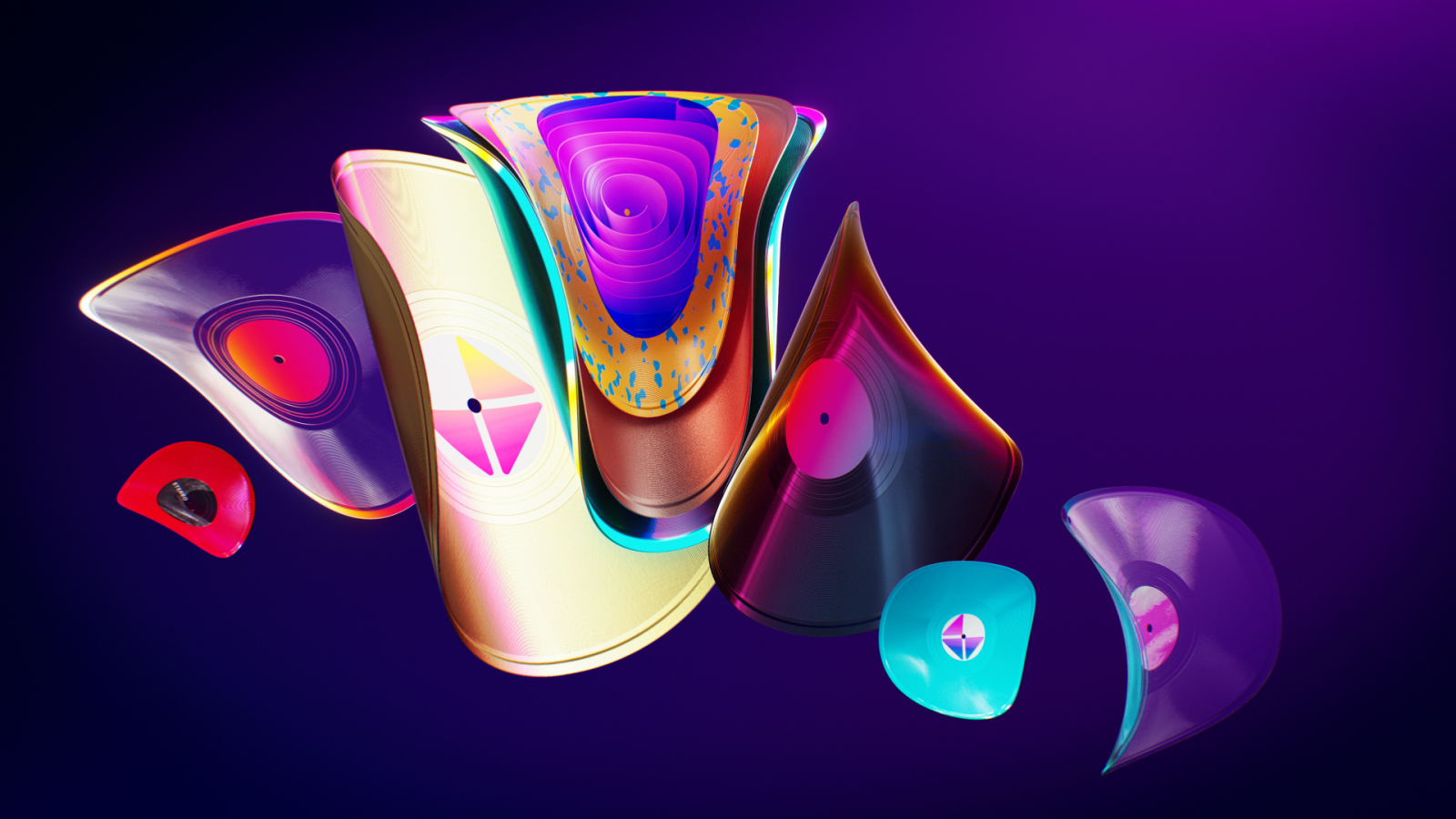 Golden Dozen 圖表設(shè)計的想法是基于 90 年代和 2000 年代常見用具的超現(xiàn)實體現(xiàn):靈活的黑膠唱片、彩色磁帶倒帶鉛筆和飛行鏡盤。全息風(fēng)格的物體被“熔化”成真金,形成“金”計劃的新標(biāo)志。