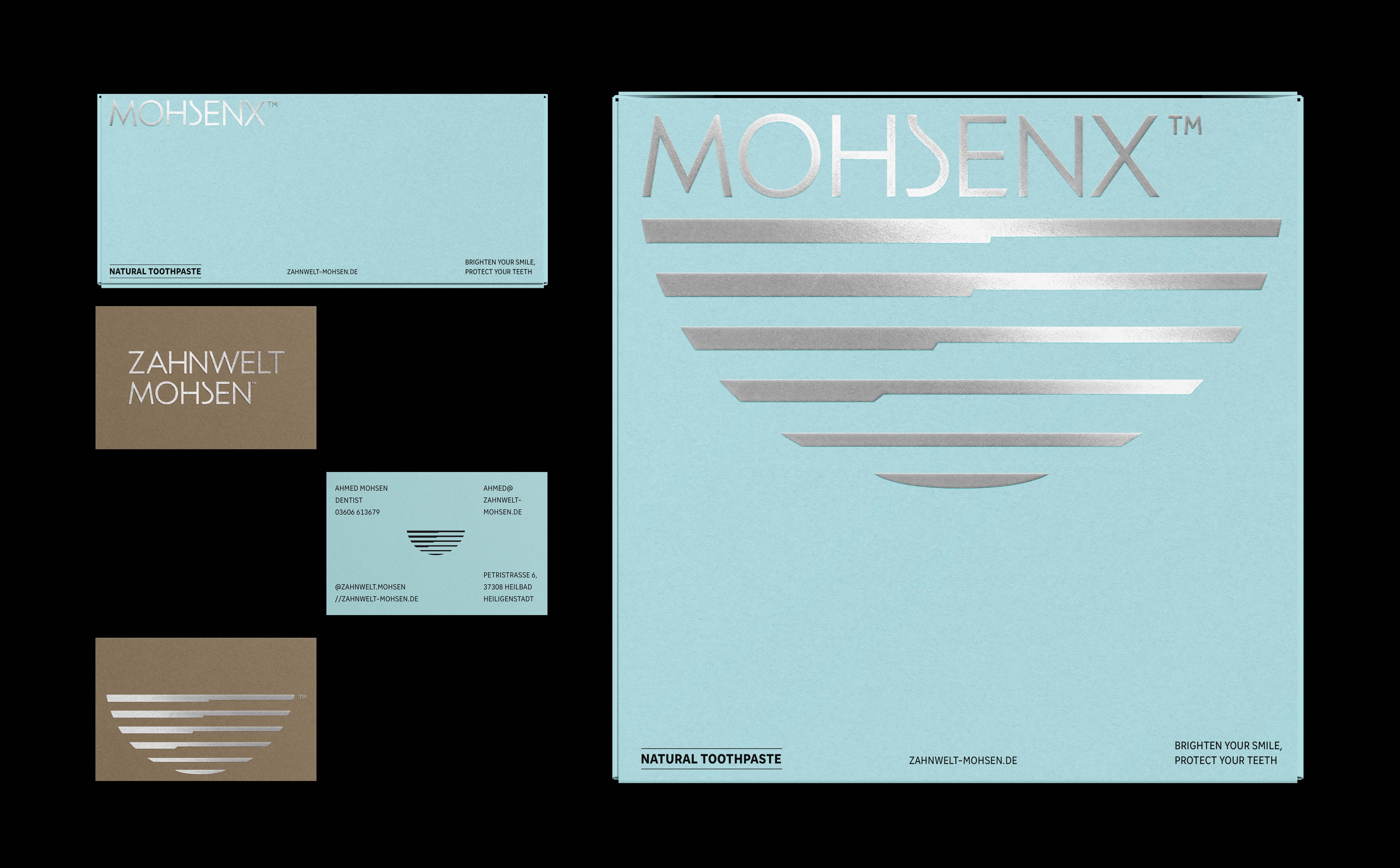 MohsenX的視覺標(biāo)識logo設(shè)計(jì)旨在傳達(dá)現(xiàn)代感和責(zé)任感。包裝設(shè)計(jì)體現(xiàn)了精致、清晰和可持續(xù)性的無縫融合。清新的調(diào)色板與時(shí)尚的現(xiàn)代排版相結(jié)合,強(qiáng)化了該品牌的創(chuàng)新和奢華信息。這種周到的設(shè)計(jì)旨在吸引那些不僅重視有效的口腔護(hù)理,而且重視對環(huán)境溫和的產(chǎn)品的消費(fèi)者。