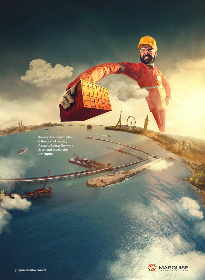 由Bravo / BBG廣告公司,為侯爵夫人集團(tuán)(Marquise Group)創(chuàng)建的平面廣告創(chuàng)意設(shè)計(jì),以慶祝巴西東北部的Porto do Pecem佩切姆港開(kāi)通。廣告設(shè)計(jì)作品用一個(gè)拿著集裝箱的超長(zhǎng)拉伸的手臂,環(huán)繞地球來(lái)表現(xiàn)拉近世界,廣告畫面非常有創(chuàng)意和視覺(jué)美感。